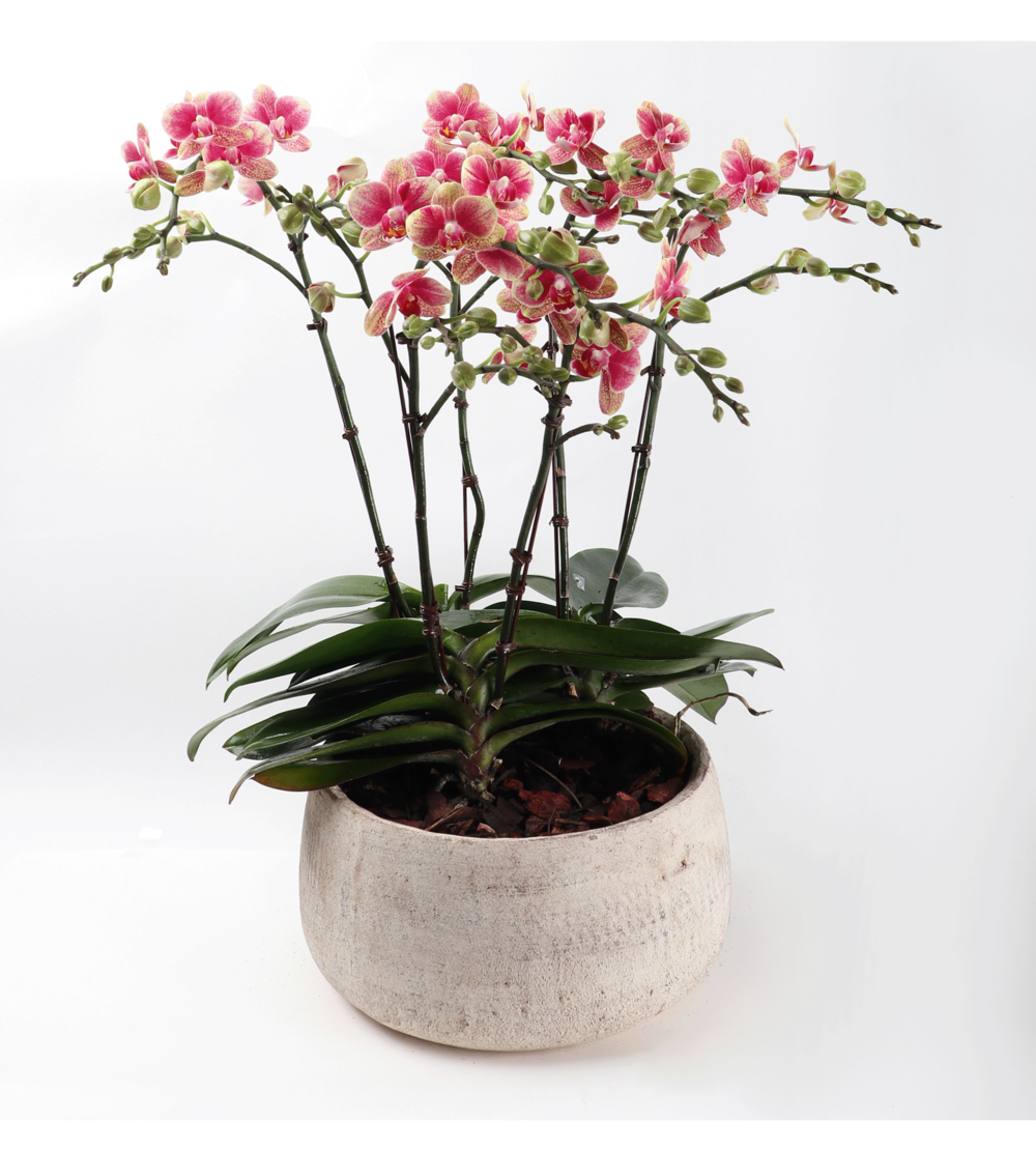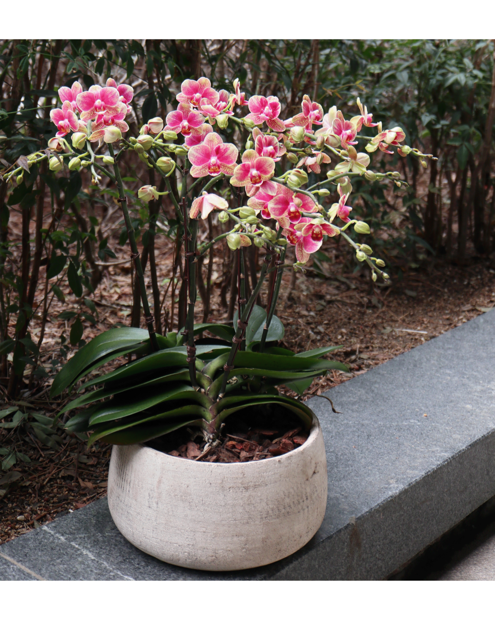 앤틱한 핑크 색상과 묵직한 화분에 호접란 3포트가 심어져 있으며