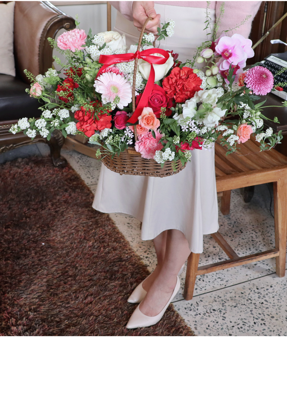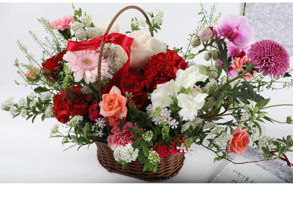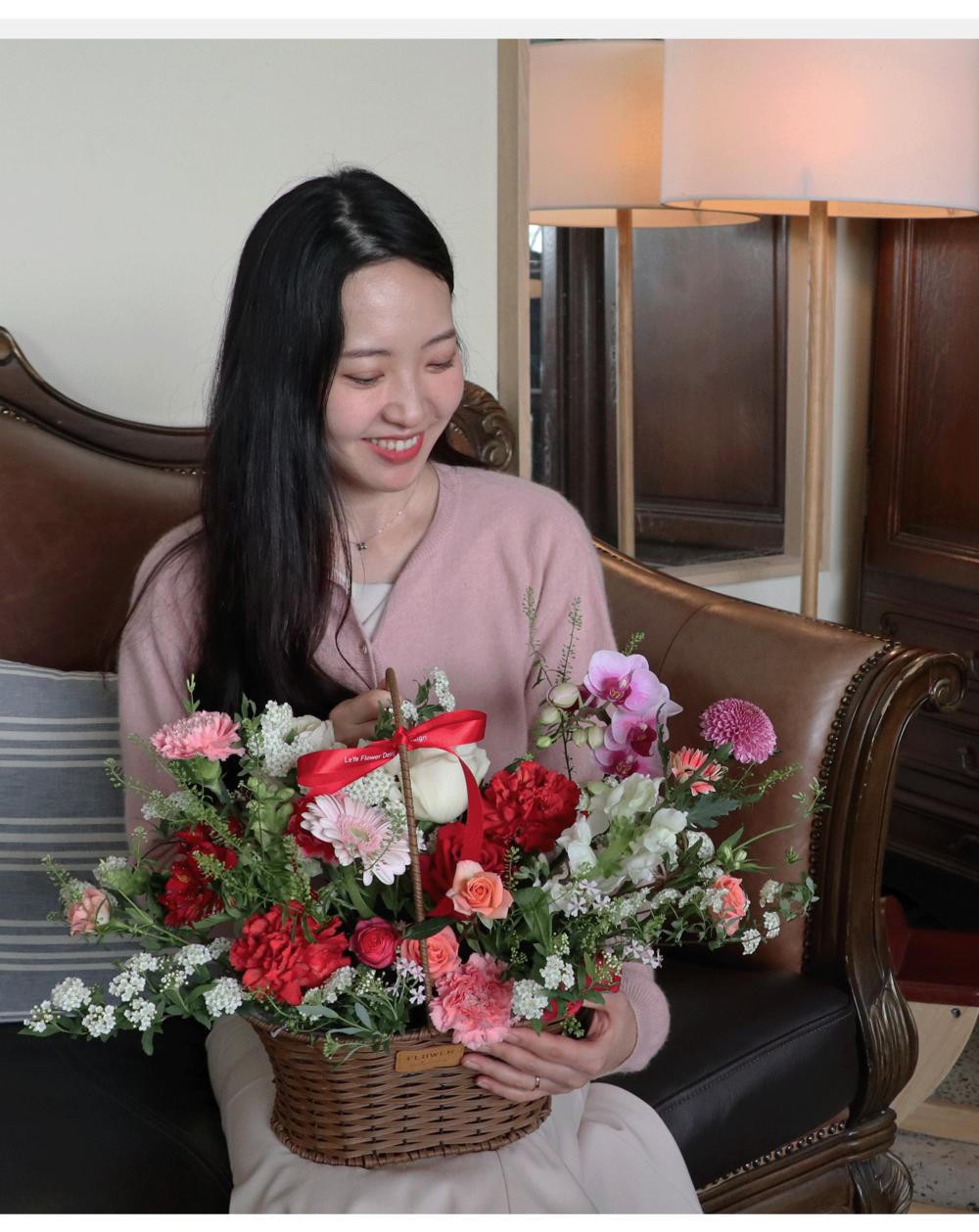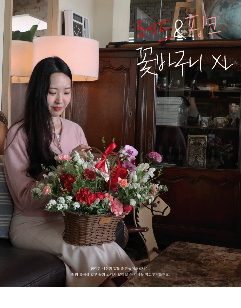 쨍한 레드와 부드러운 핑크가 섞인 꽃바구니입니다.