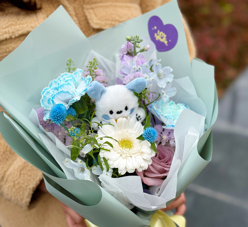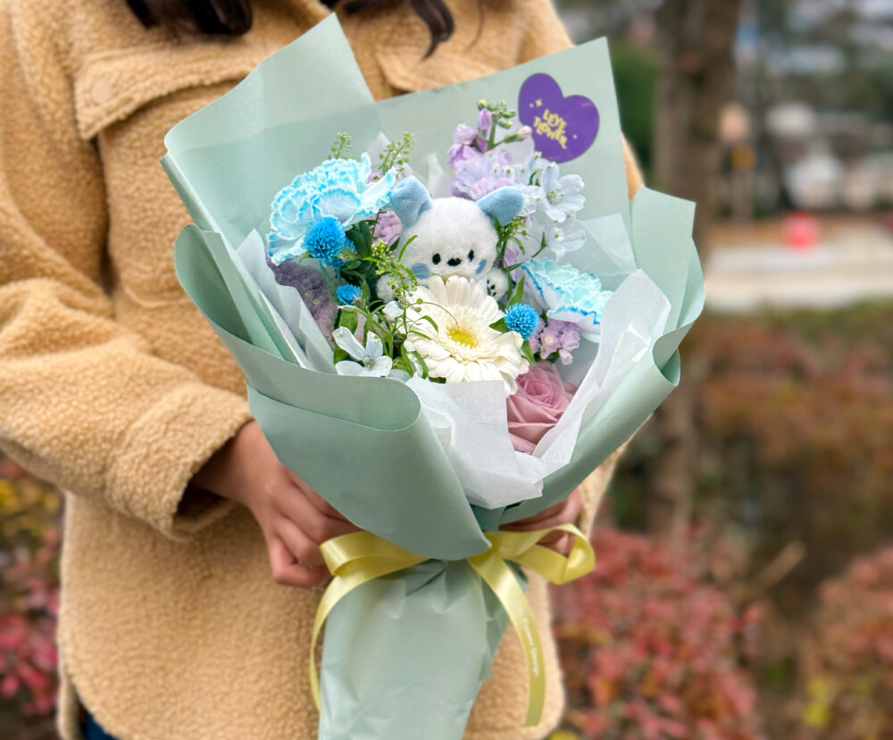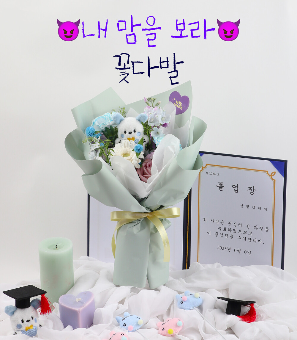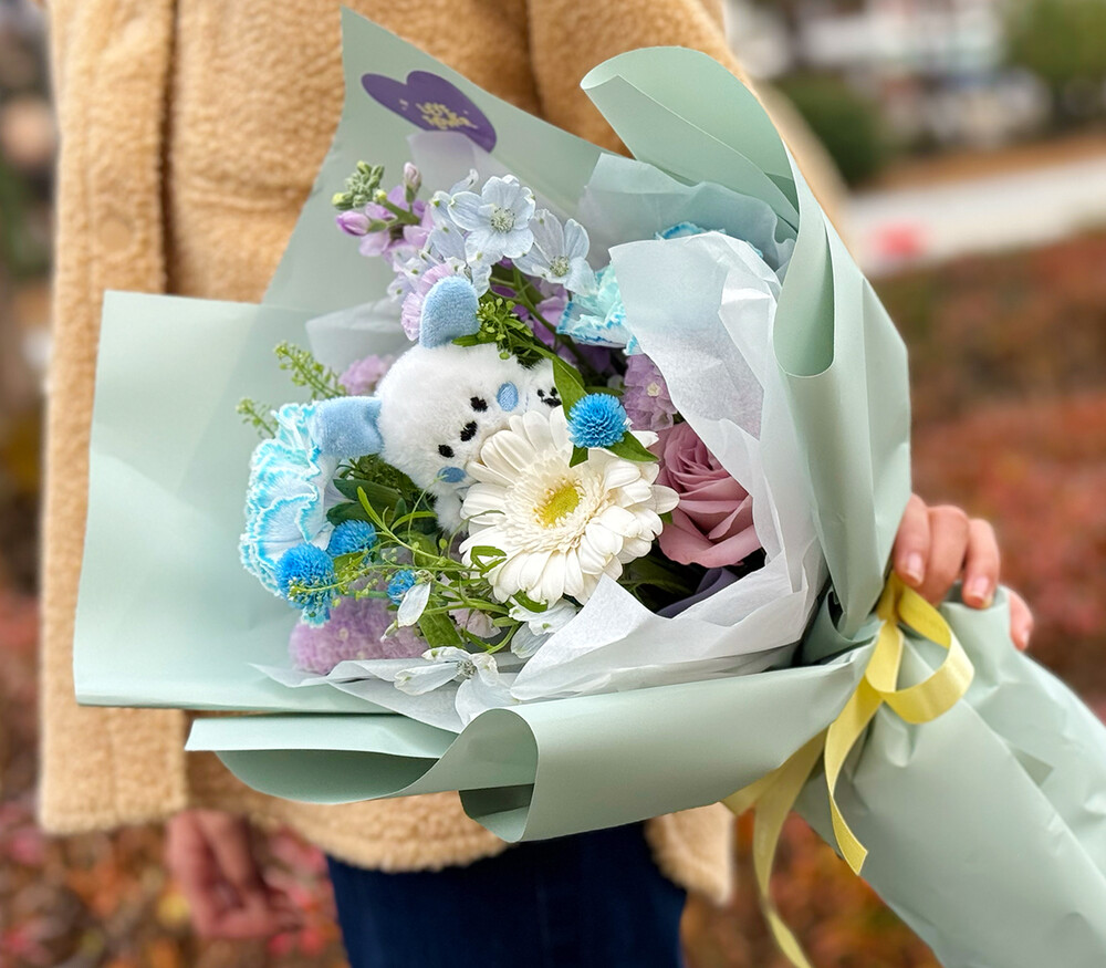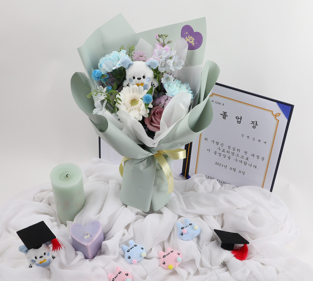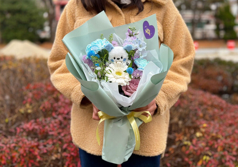 꽃 사이에 아담한 인형도 같이 넣어드려 졸업식,연주회 등 선물로 제격이랍니다-