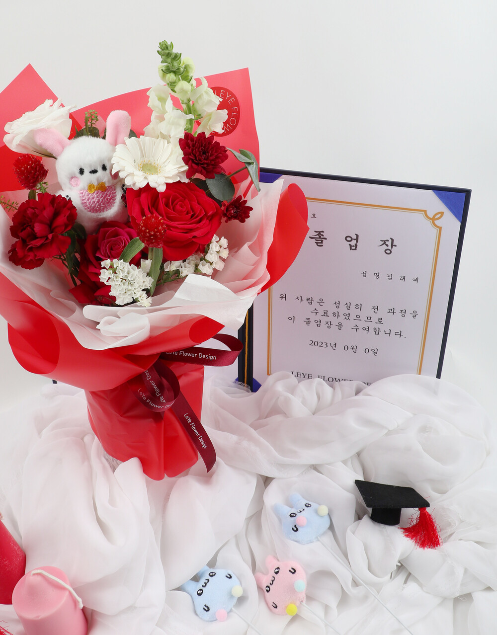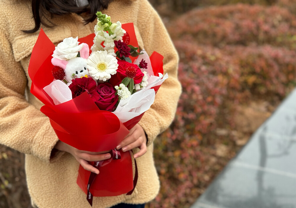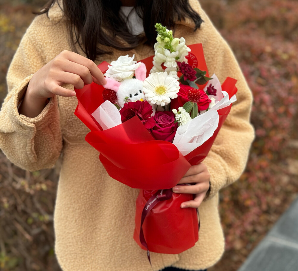 꽃 사이에 아담한 인형도 같이 넣어드려 졸업식,연주회 등 선물로 제격이랍니다-