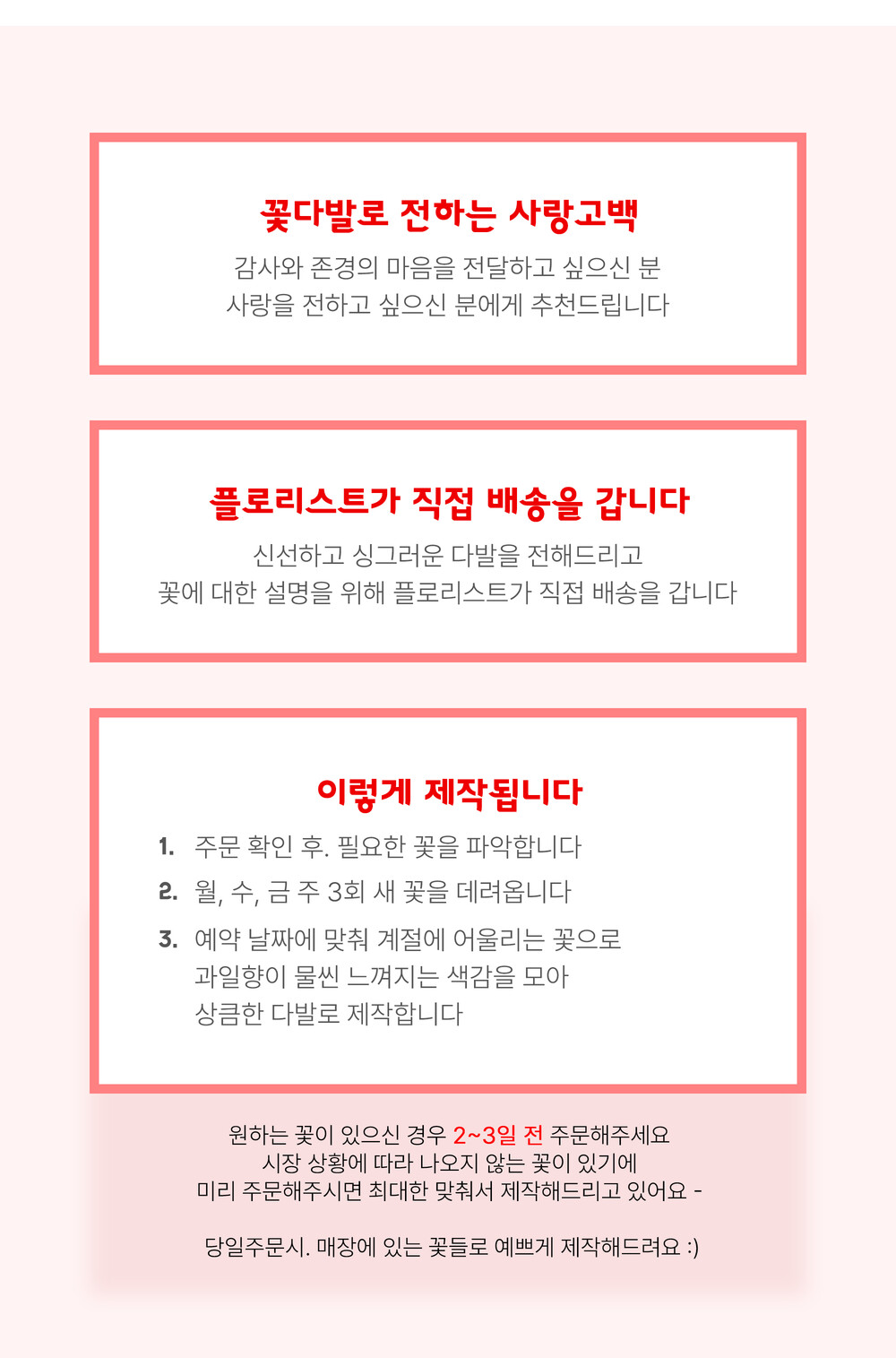 미리 예약해 주시면 플로리스트가 더욱 정성을 다해 준비해 드릴 수 있어요