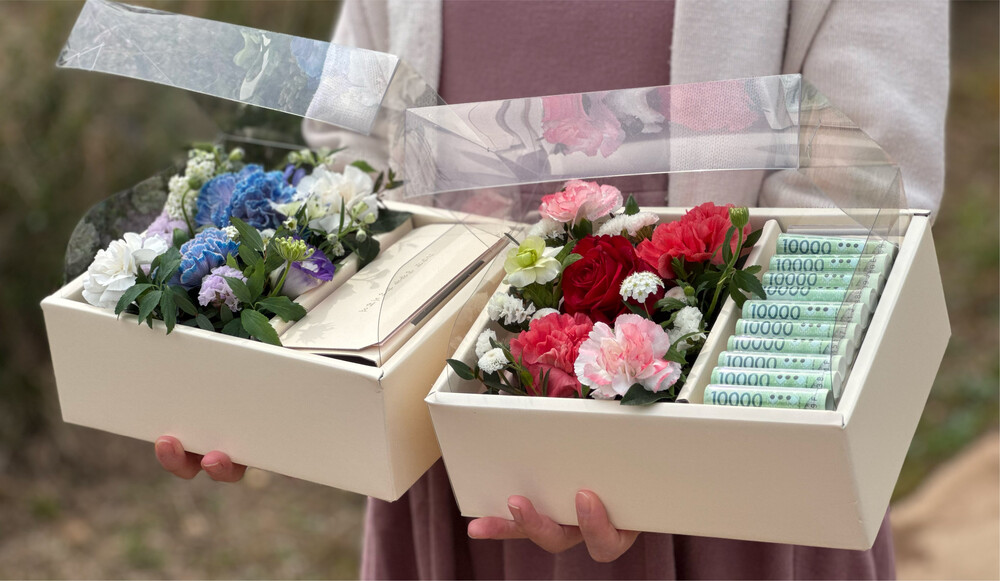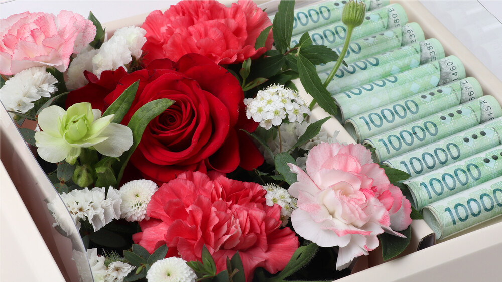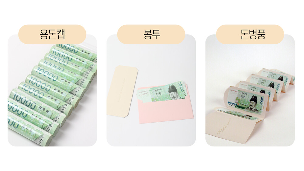 옆에 용돈을 넣을 수 있는 용돈캡, 봉투, 돈병풍틀이 준비되어 있어요