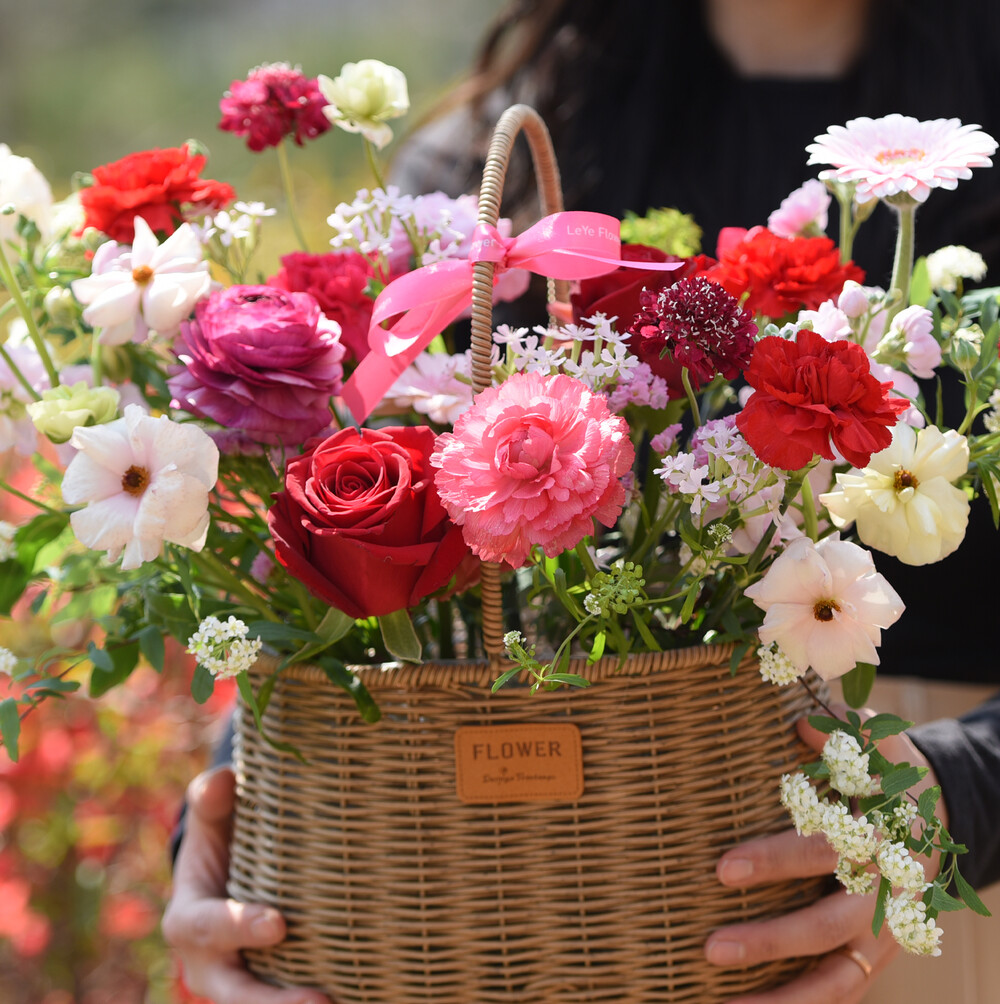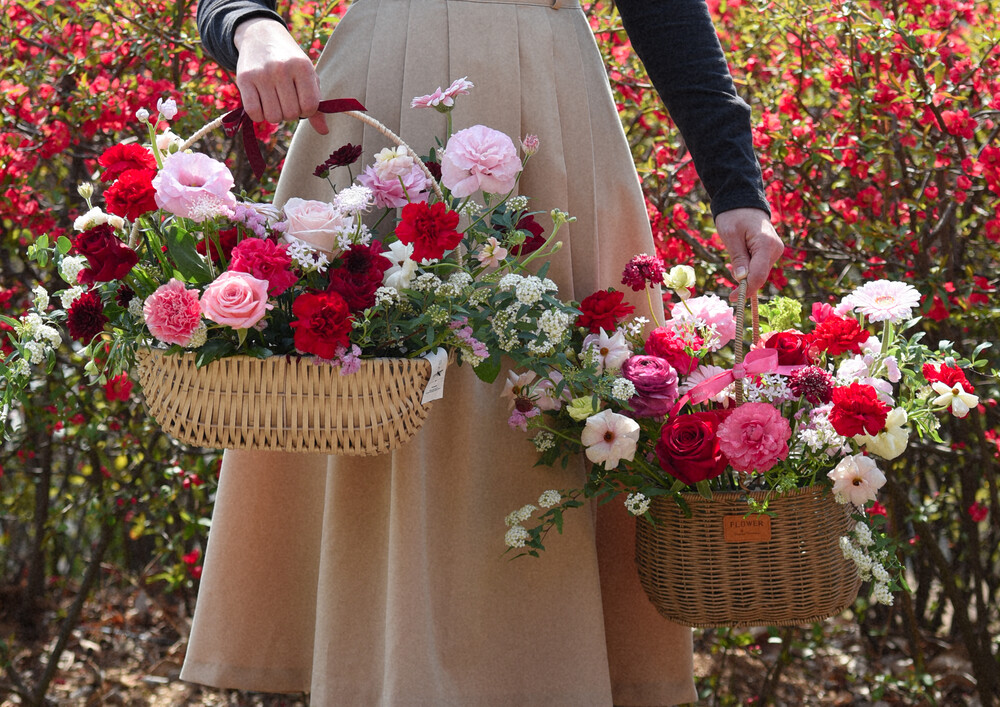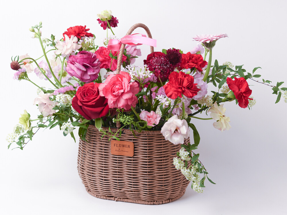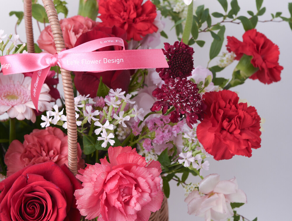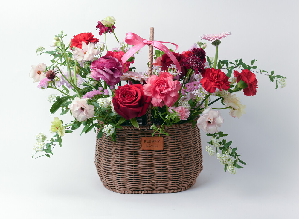 진한 레드와 핑크를 조합한 꽃바구니입니다.