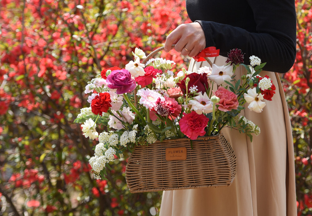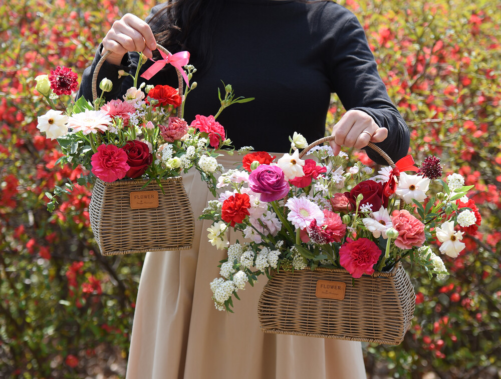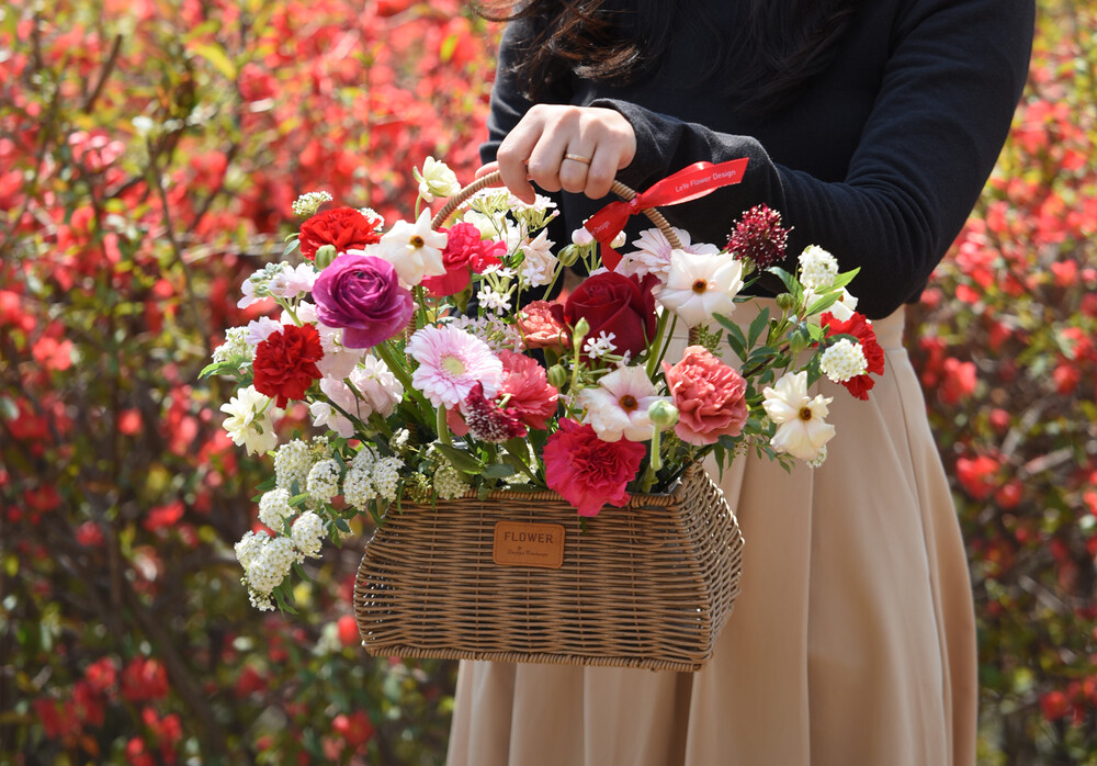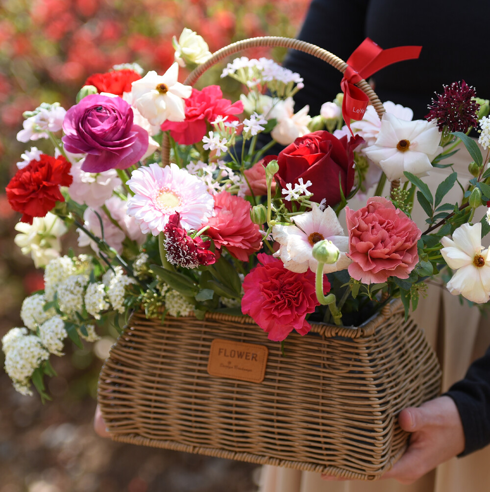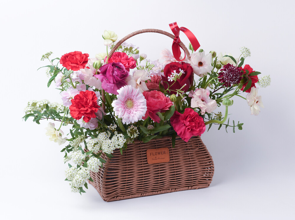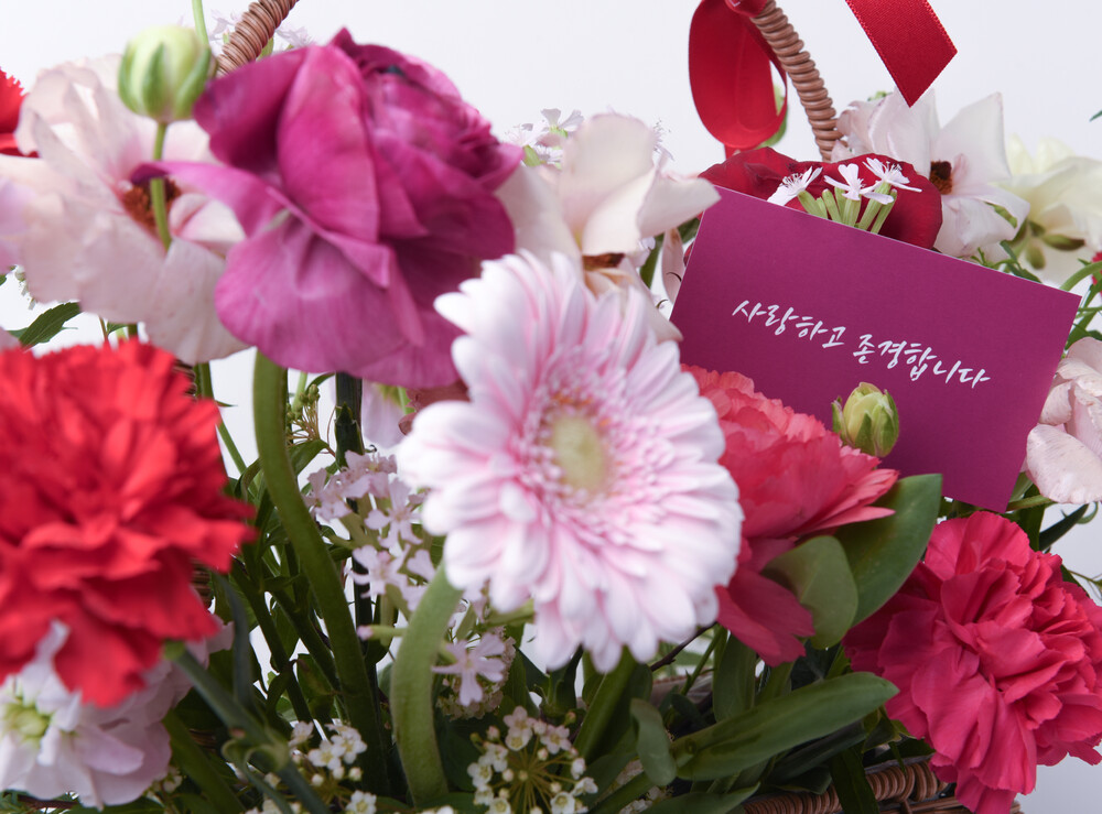 진한 레드와 핑크를 조합한 꽃바구니입니다.