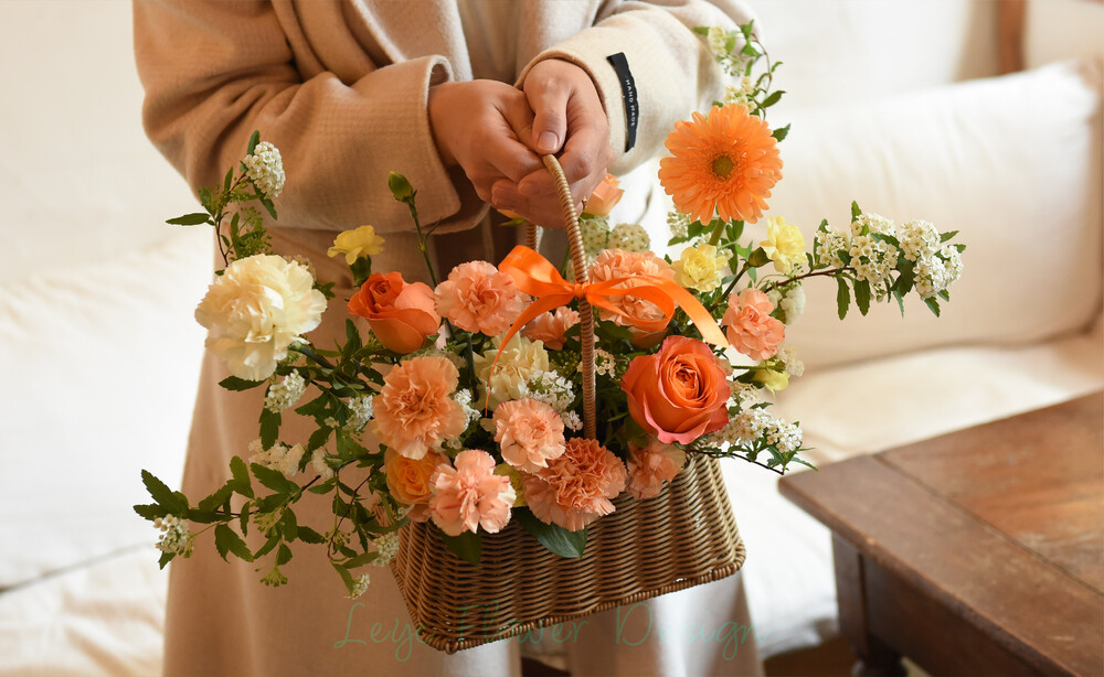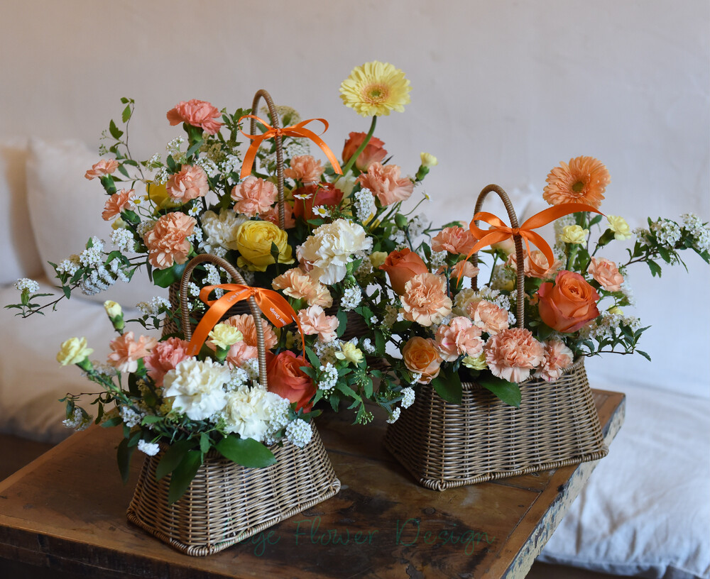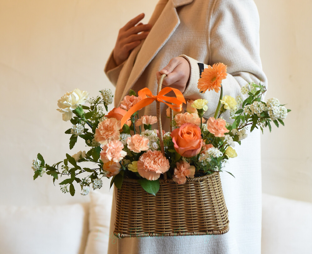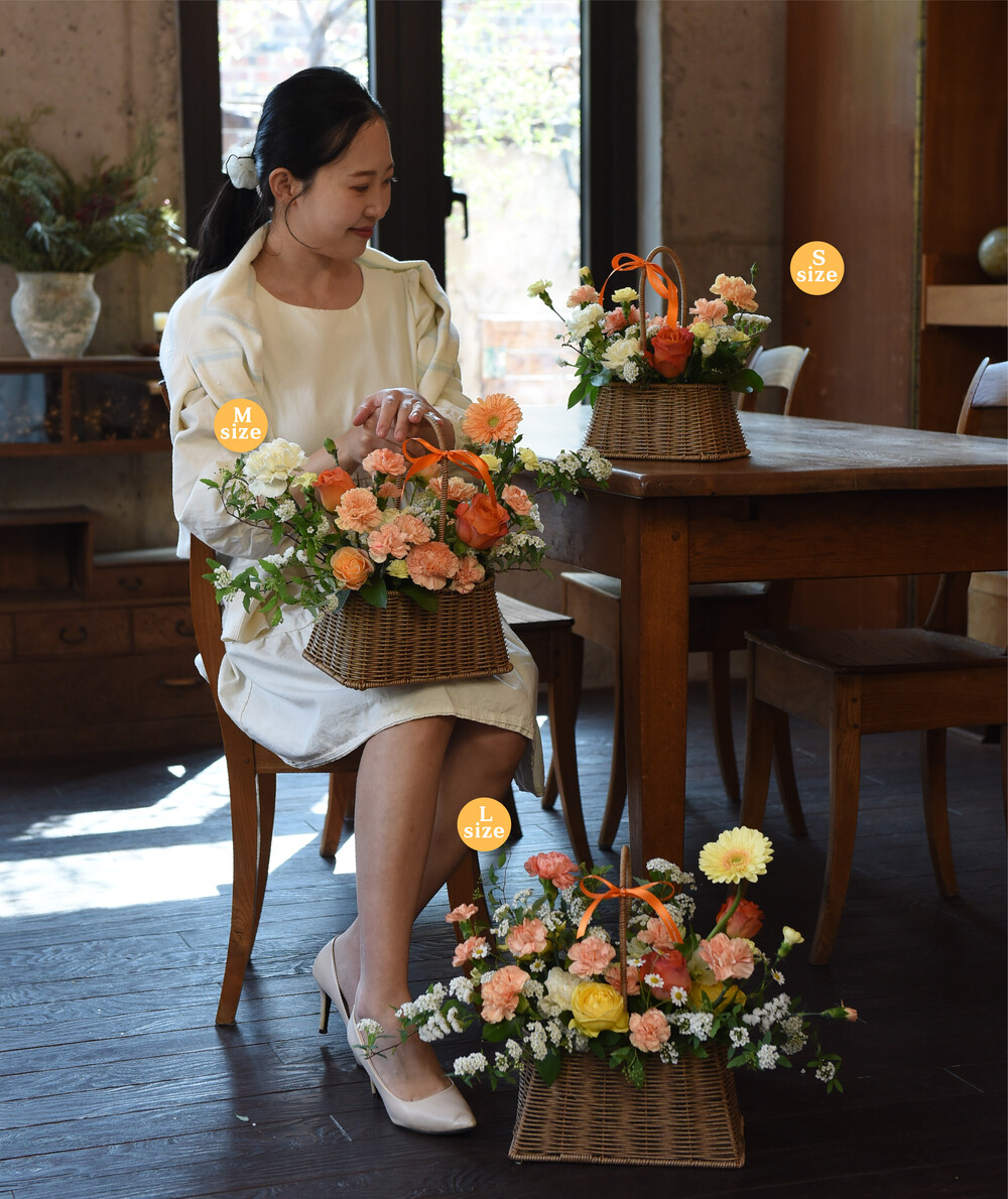 따스한 햇살을 머금은 듯한 오렌지와 옐로우 컬러로 제작된 꽃바구니입니다