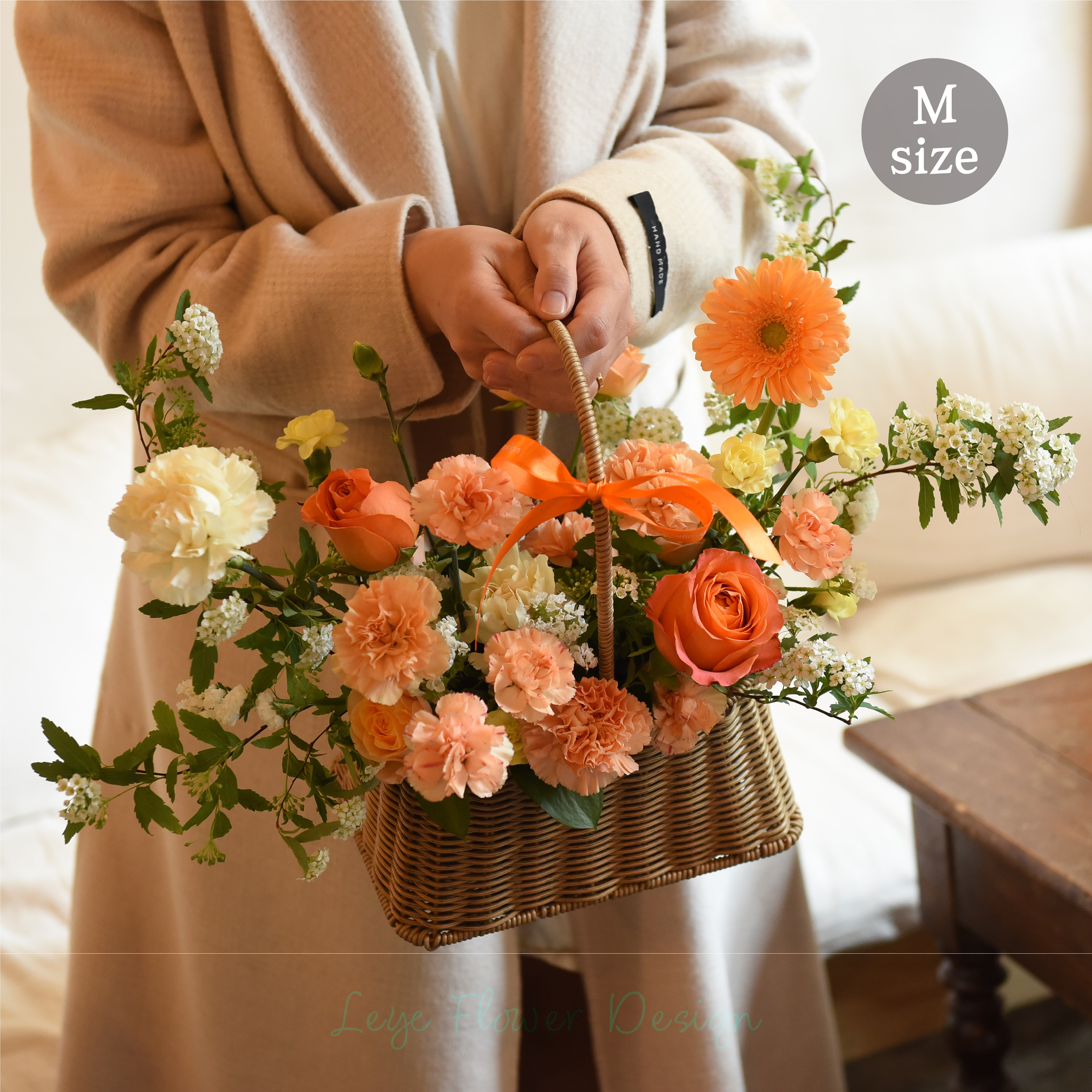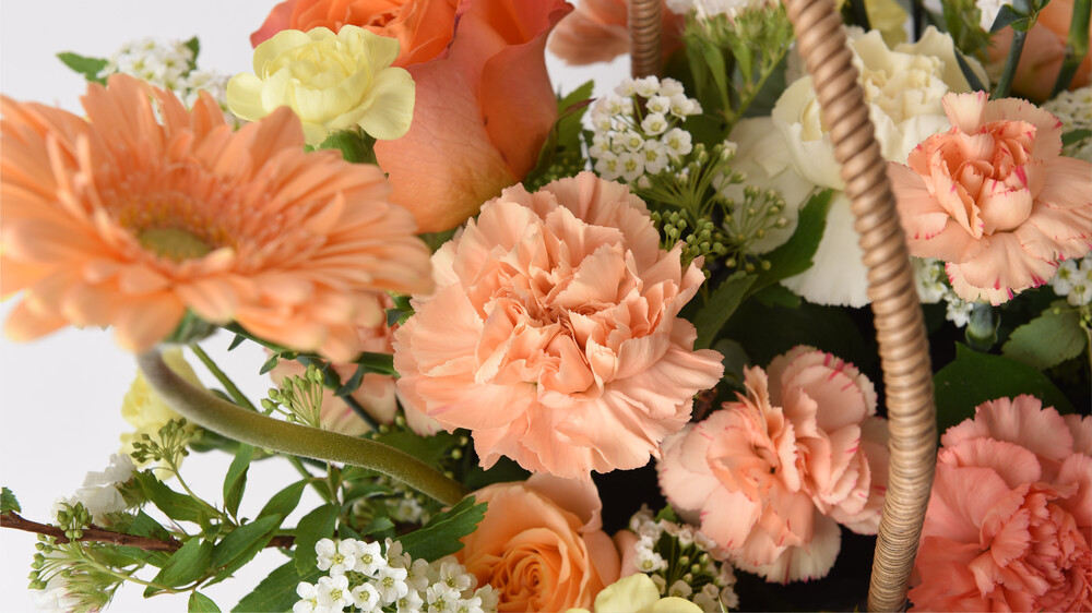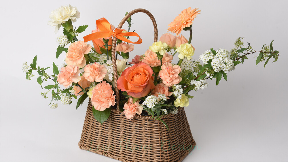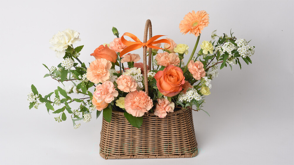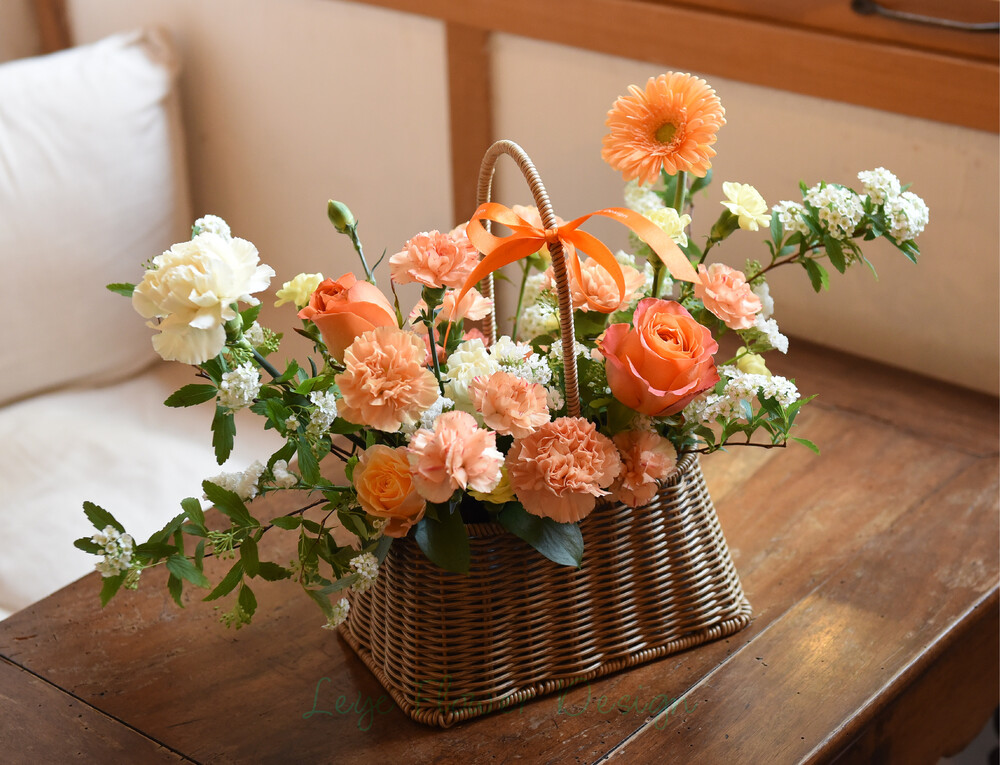 따스한 햇살을 머금은 듯한 오렌지와 옐로우 컬러로 제작된 꽃바구니입니다