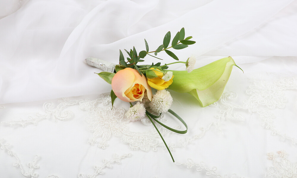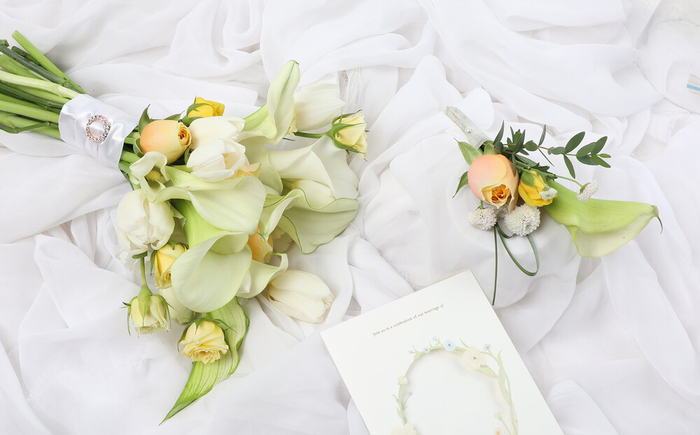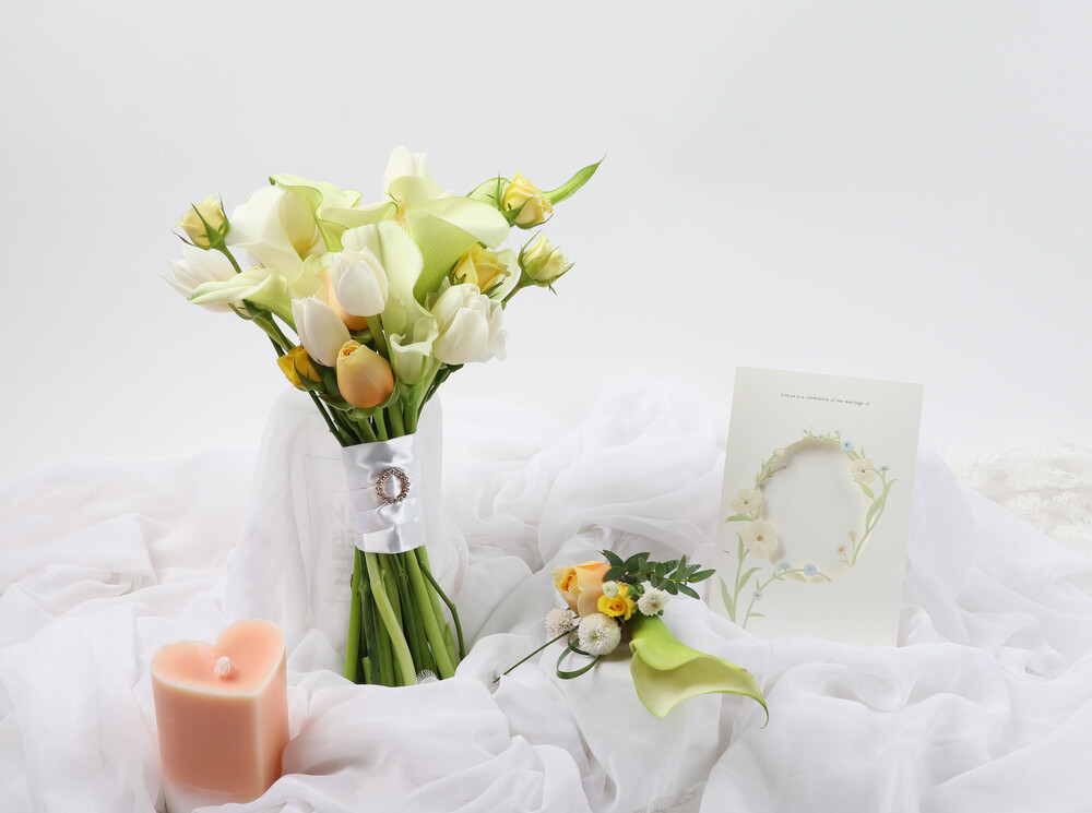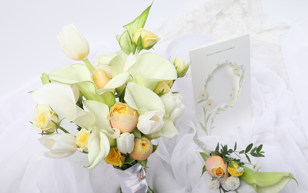 화이트옐로카라튤립에그타르트 웨딩부케