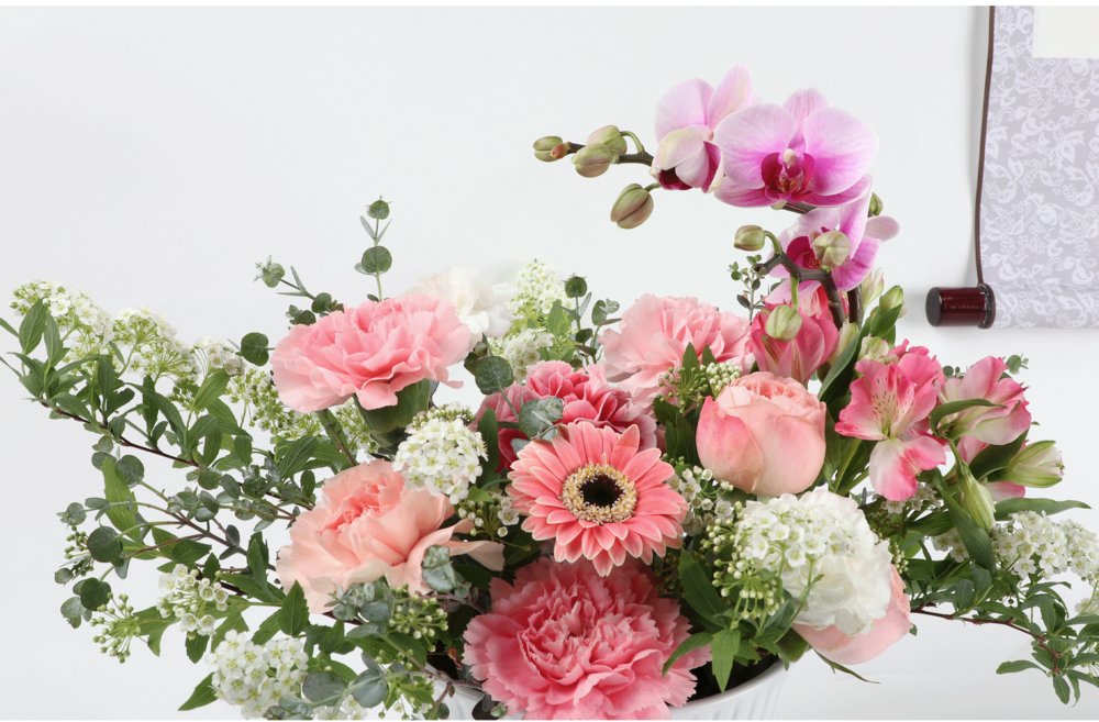 부드러운 핑크 카네이션과 '행복이 날아든다' 라는 꽃말을 가지고 있는